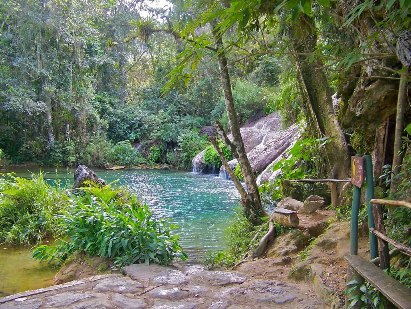El Nicho est un parc écotouristique situé dans le grand parc naturel de Topes de Collantes, à une altitude moyenne de 440 mètres au-dessus du niveau de la mer. L’accès depuis la ville de Cienfuegos est plus direct et régulier, c’est pourquoi cet itinéraire est privilégié. Le sentier El Reino de las Aguas (Le Royaume des Eaux), long de 2 km, combine une végétation luxuriante, des plantations de café, des grottes, des cascades et des piscines naturelles où l’on peut se rafraîchir. L’itinéraire avec des montées et des descentes commence à la Poceta de los Enamorados (Piscine des Amoureux) et s’étend jusqu’à la Poceta de Cristal (Piscine de cristal). Entre les deux se trouve le Salto de los Desparramaderos, avec un accès au Mirador. De là, on peut admirer le lac Hanabanilla.